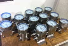 氧气压力表实际上属于一般压力表之类,不同的是该类的压力表测量的工作介质是氧气。由于氧气与油脂接触发热燃烧甚至有发生爆炸的危险,所以氧气压力表工作或者校验过程中是绝对禁油(甘油除外)的。必要时要对氧气表进行无油脂检查。