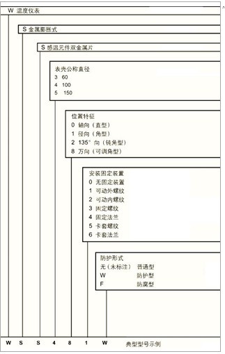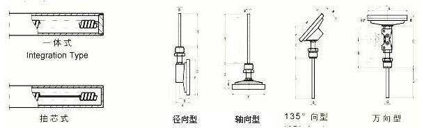 双金属温度计分为,轴向型双金属温度计,径向型双金属温度计,135°向型双金属温度计,万向型双金属温度计,电接点双金属温 度计,隔爆双金属温度计,带电偶远传双金属温度计,带热电阻远传双金属温度计,耐震双金属温度计,耐震电接点双金属温度计,热套式双金属温度计及特种双金 属温度计系列(特种温度计可以根据客户样品或图纸生产),型号有WSS WSSX WSSX-B WSSE WSSP WSSXE WSSXP 系列,双金属温度计是一种测量中低温度的现场检测仪表。可以直接测量各种生产过程中的-80℃-+500℃范围内液体蒸汽和气体介质温度。