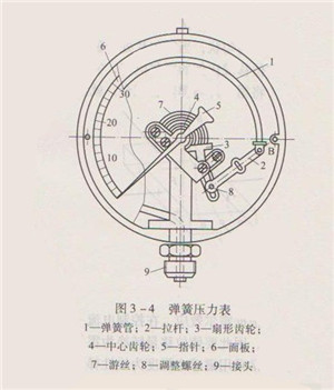 游丝7用来克服因扇形齿轮与中心齿轮间的传动间隙而产生的仪表变差。改变调整螺丝8的位置,可调整仪表量程。